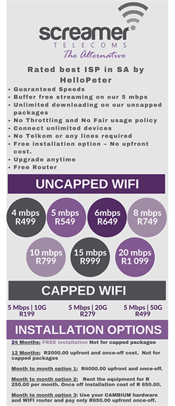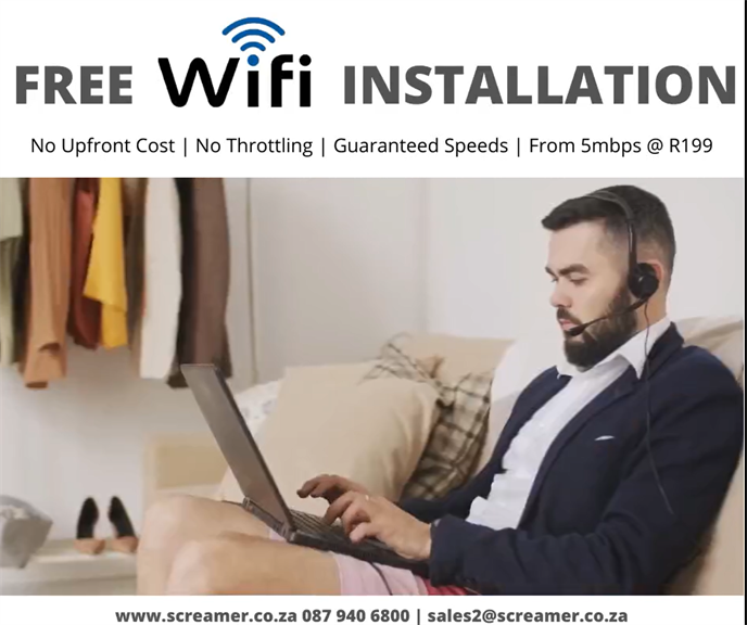 Screamer Telecoms wireless internet uncapped service & the best wireless uncapped wifi deals are available across SA. Screamer Telecoms offer a full wifi connection service & will set up your Internet & WiFi & provide you with a free wireless router.