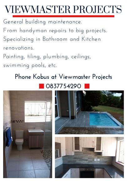 I specialize in bathroom and kitchen renovations. I also do small and large building renovations, painting and plumbing.