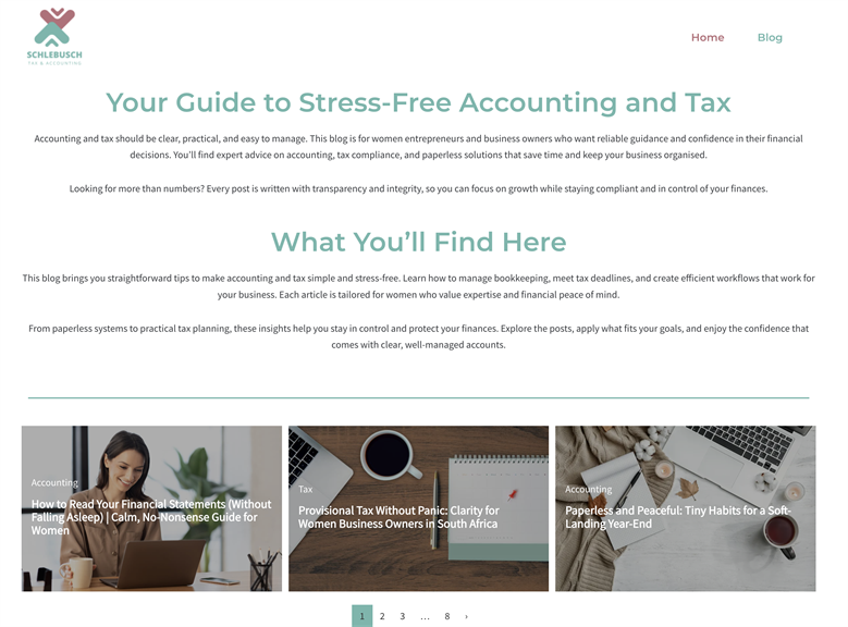 Schlebusch Tax & Accounting is a boutique, paperless practice serving Centurion and Pretoria. I support women-owned businesses, sole proprietors, and individuals with tax returns, catch-up bookkeeping, VAT and provisional tax, and SARS compliance rescue. Clear upfront pricing, thorough work, and consistent follow-through—so you can focus on your business with confidence. Explore my blog for practical guidance and real-world tips.