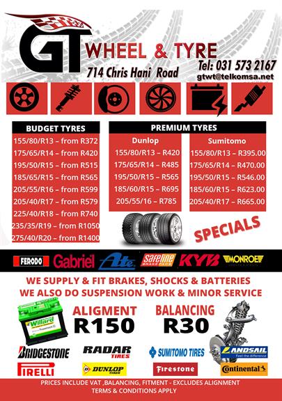 A new tyre fitment centre in the market. We specialize in Passenger Tyres, Truck Tyres, Mag Wheels, 3D alignment, Balancing, Suspension, supply and fitting of Brake Pads, Shocks and Batteries. We also do minor services and carry service kits for most vehicles.