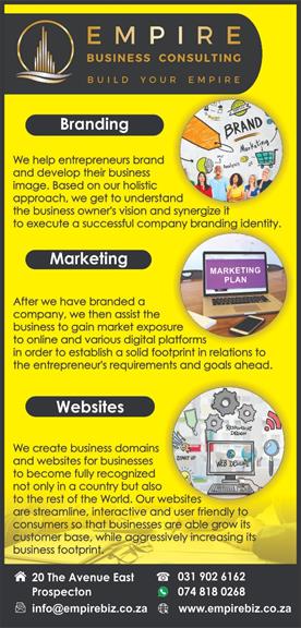 Our services include the following: Company Registrations, CSD Registrations, Monthly Bookkeeping, Business Plans, Business Funding, Business Proposals, Business Training, Energy licensing, Websites, Health and Safety Files, Branding and Marketing. We assist Businesses with Grant and Developmental Funding in Various Sectors to help with Equipment, Vehicles, Stock, Working Capital to run and expand their businesses. By assisting with File Preparations and Applications Process, we ensure that applications are successful to businesses.