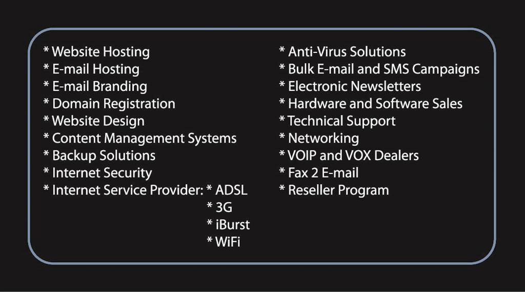 We align ourselves with companies who share the same view on service excellence and work as outsourced Technical Consultants for clients as well as provide businesses with their own Full Scale external IT Department.