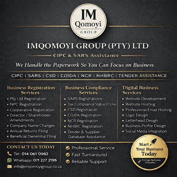 Imqomoyi Group (Pty) Ltd provides professional business support and compliance services to entrepreneurs and companies across South Africa. We assist with CIPC company registration, company amendments, CIPC annual returns, CSD registration, CIDB registration support, BEE affidavits and tender documentation preparation. Our goal is to simplify business compliance processes and help clients meet regulatory requirements quickly and efficiently. Whether you are starting a new business or updating company records, Imqomoyi Group offers reliable, professional assistance to keep your business compliant and ready for opportunities.