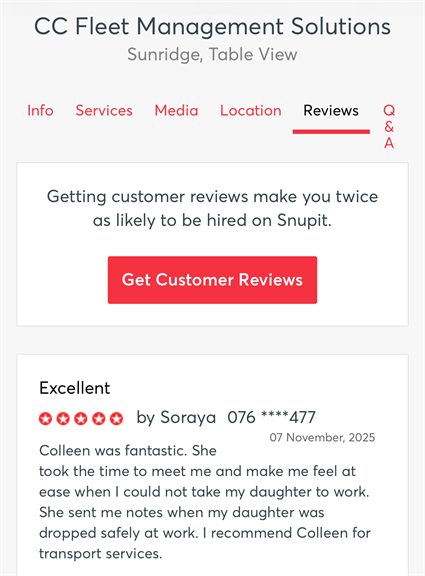 Colleen was fantastic. She took the time to meet me and make me feel at ease when I could not take my daughter to work. She sent me notes when my daughter was dropped safely at work. I recommend Colleen for transport services.
