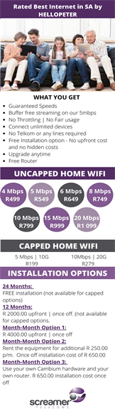 Screamer Telecoms wireless internet uncapped service & the best wireless uncapped wifi deals are available across SA. Screamer Telecoms offer a full wifi connection service & will set up your Internet & WiFi & provide you with a free wireless router.